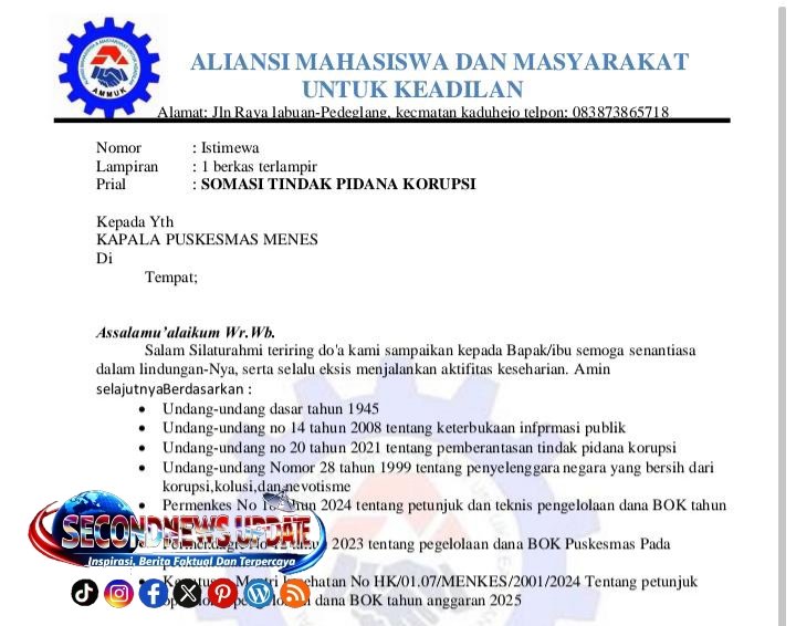 Pandeglang Banten//secondnewsupdate.co.id – Aktivis Mahasiswa dan Masyarakat Untuk Keadilan (AMMUK) melayangkan surat somasi kepada Puskesmas (PKM) Menes. Somasi tersebut berkaitan dengan sejumlah persoalan yang dinilai terjadi di internal PKM Menes, khususnya terkait dugaan kejanggalan penggunaan anggaran Bantuan Operasional Kesehatan (BOK) tahun anggaran 2025.