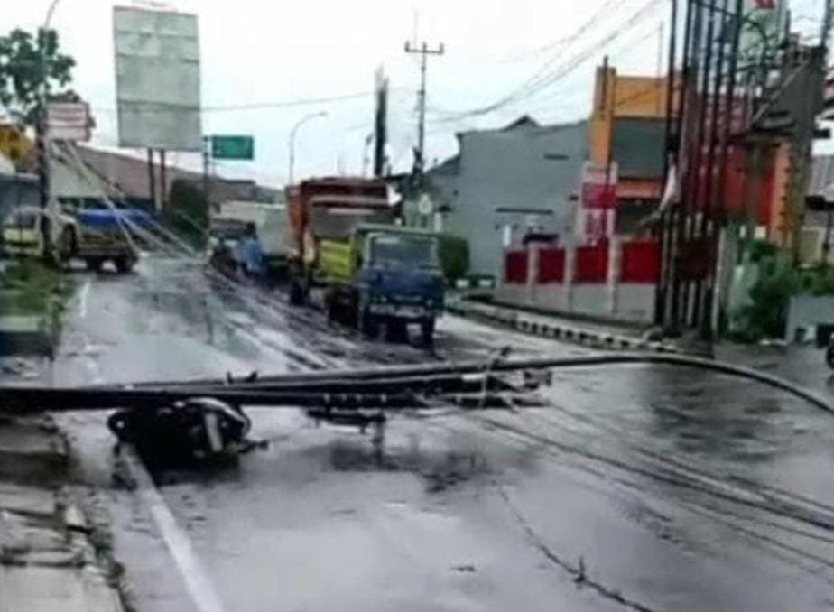 Tiang listrik rubuh tutup badan Jalan di jalan moh hatta Kota Tasikmalaya, pada Rabu(5/11/2025). (Foto:Krist)
