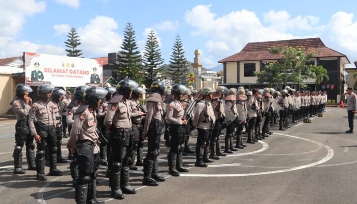 Kapolres Tasikmalaya AKBP Haris Dinzah, S.H., S.I.K., M.H didampingi Kabag Ops Polres Tasikmalaya Kompol Tikko nagiewanto menekankan pentingnya kesiapsiagaan dan kekompakan seluruh anggota Dalmas dalam menghadapi situasi di lapangan.