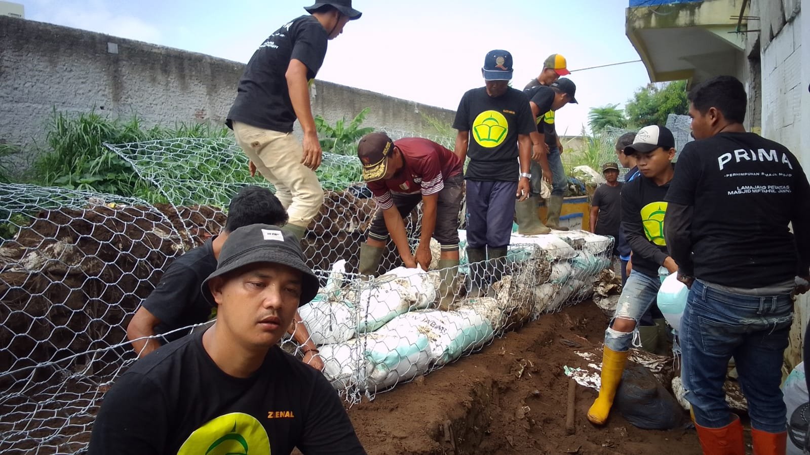 Tidak kurang dari 30 relawan PRIMA dan warga setempat bergotong royong memuat pasir dan batu ke dalam karung untuk dijadikan bronjong penahan erosi sekaligus menahan limpahan air sungai saat hujan deras turun.