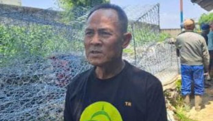Tokoh kecamatan Dayeuhkolot, Tri Rahmanto memberikan keterangan pers kepada awak media di lokasi pembuatan Bronjong, Sabtu (18/10/25)
