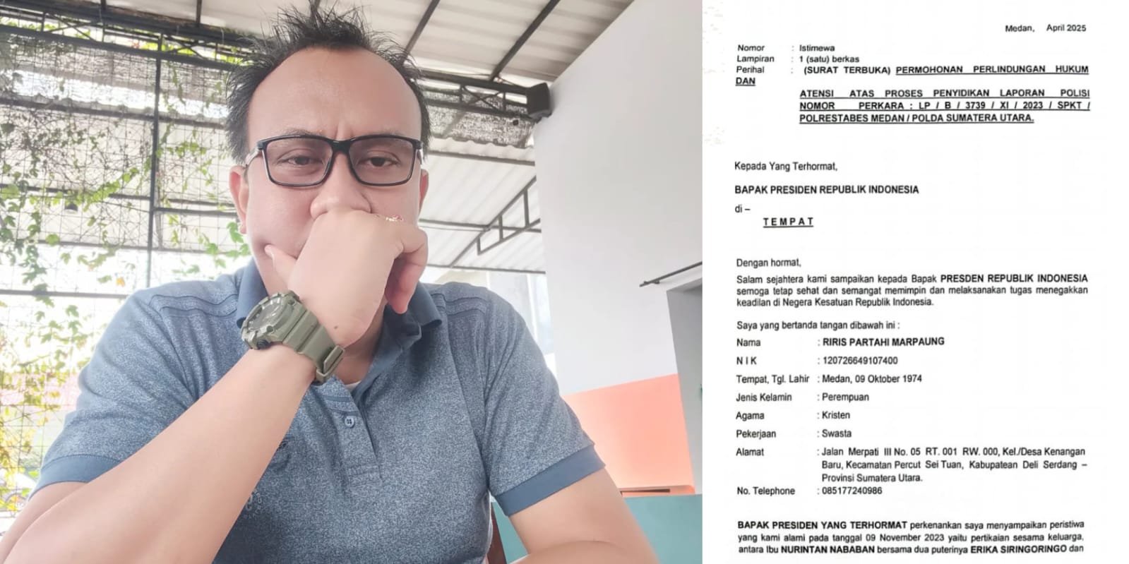Praktisi hukum, Hendrik Pakpahan,S.H mengungkapkan apresiasinya terhadap surat terbuka yang dikirimkan oleh Riris kepada Presiden Republik Indonesia. Pakpahan menilai surat tersebut sebagai bentuk keberanian dan kepedulian warga negara dalam menyuarakan aspirasi.(Kiri) Bukti surat yang diajukan kepada presiden Republik Indonesia Prabowo Subianto