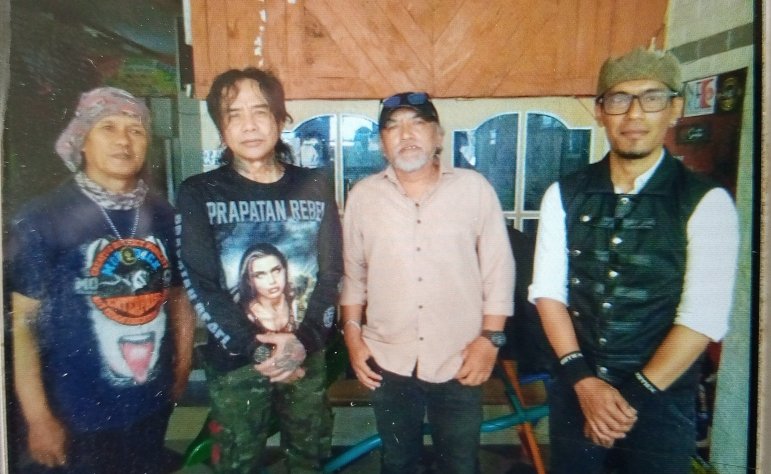 Iwan Palsu (kedua dari kanan) dan Gitaris Babone, berfoto bersama.personel Moby Dick Com Band usai latihan di Kopo, Bandung Rabu, (18/6)