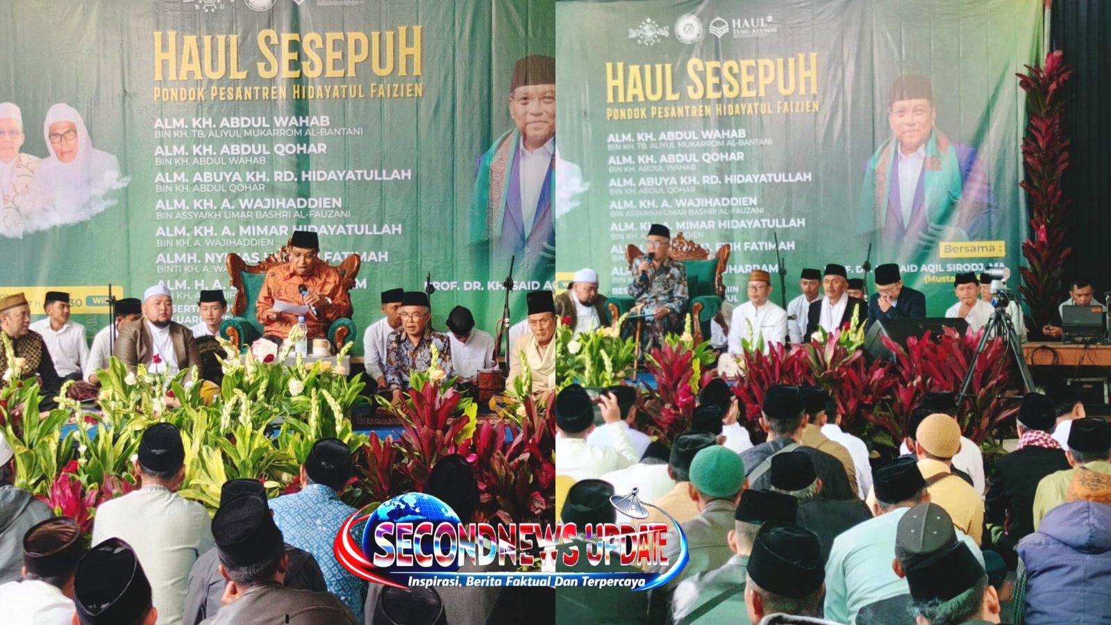 Foto Kiri : Tausiyah Prof. Dr. KH. Said Aqil Siroj, MA dalam Haul Sesepuh Ponpes Hidayatul Faizien menekankan pentingnya menjaga tradisi haul, memperkuat silaturahmi, serta menegakkan sholat sebagai fondasi kehidupan umat. Foto Kanan : Tahlil dan doa bersama dipimpin KH. Atjeng Abdul Wahid berlangsung khusyuk dan penuh haru.