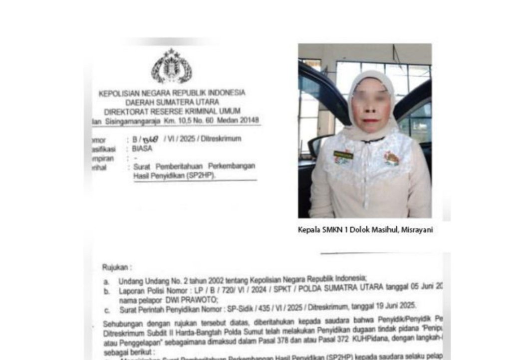 SNU//Medan – Penanganan kasus dugaan penipuan dan penggelapan yang melibatkan Kepala SMKN 1 Dolok Masihul, Misrayani SPd MSi, resmi memasuki tahap baru.