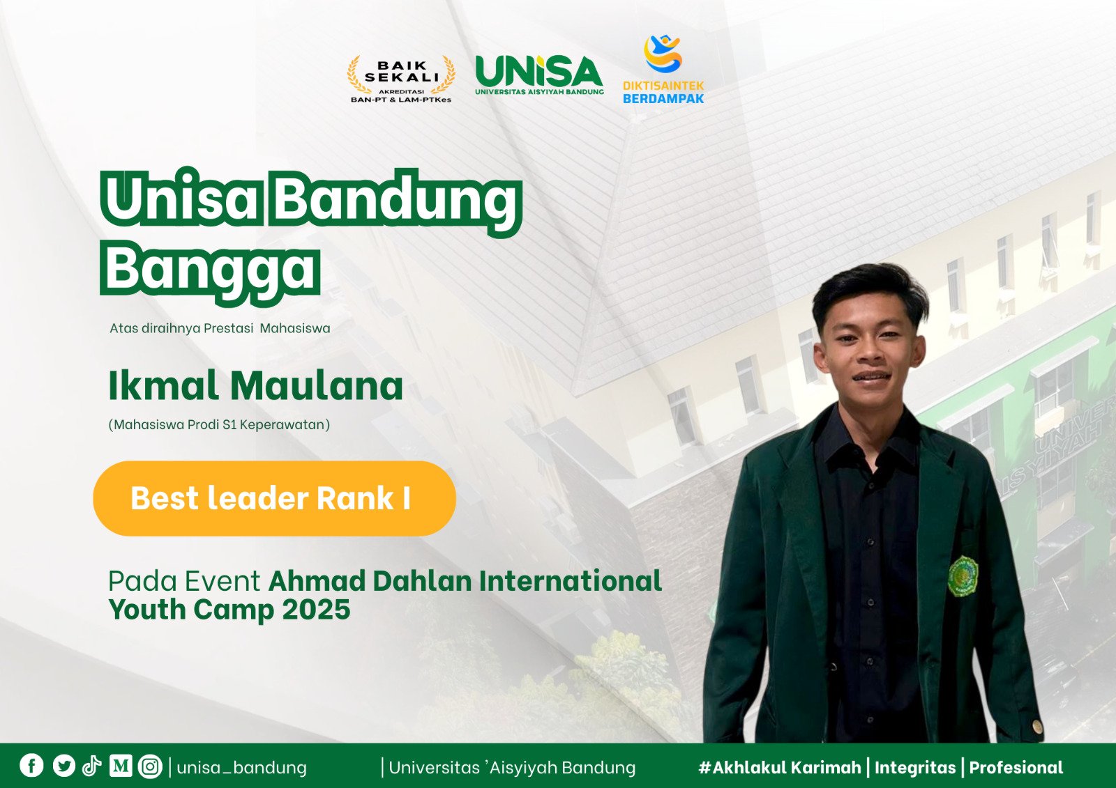 Ikmal Maulana, mahasiswa Program Studi Sarjana Keperawatan Universitas ‘Aisyiyah (UNISA) Bandung, raih predikat Best Leader Rank 1 pada Ahmad Dahlan International Youth Camp (ADIYC) 2025.