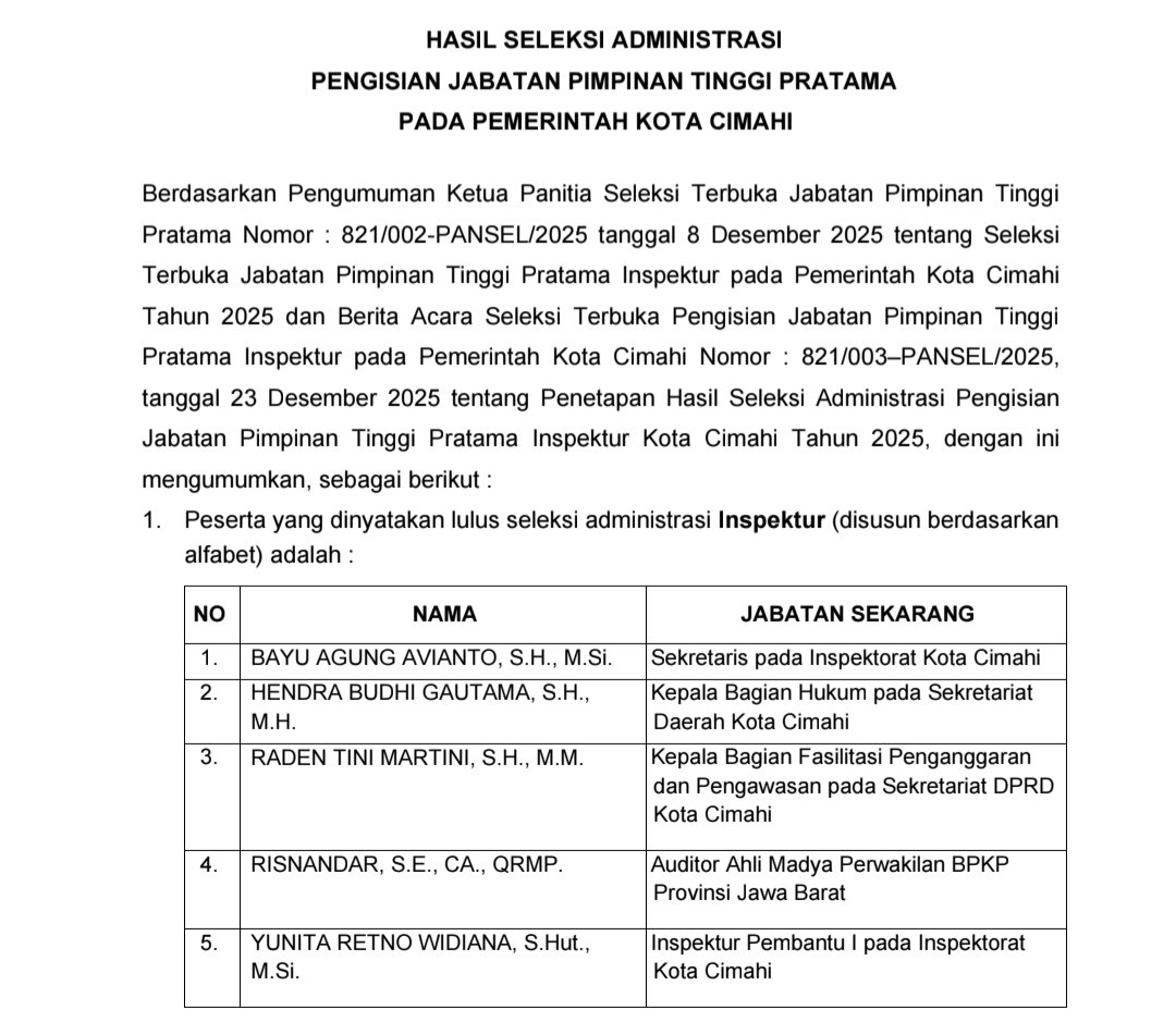 Cimahi/secondnewsupdate.co.id – Pemerintah Kota Cimahi resmi mengumumkan hasil seleksi administrasi Pengisian Jabatan Pimpinan Tinggi (JPT) Pratama Inspektur Kota Cimahi Tahun 2025.