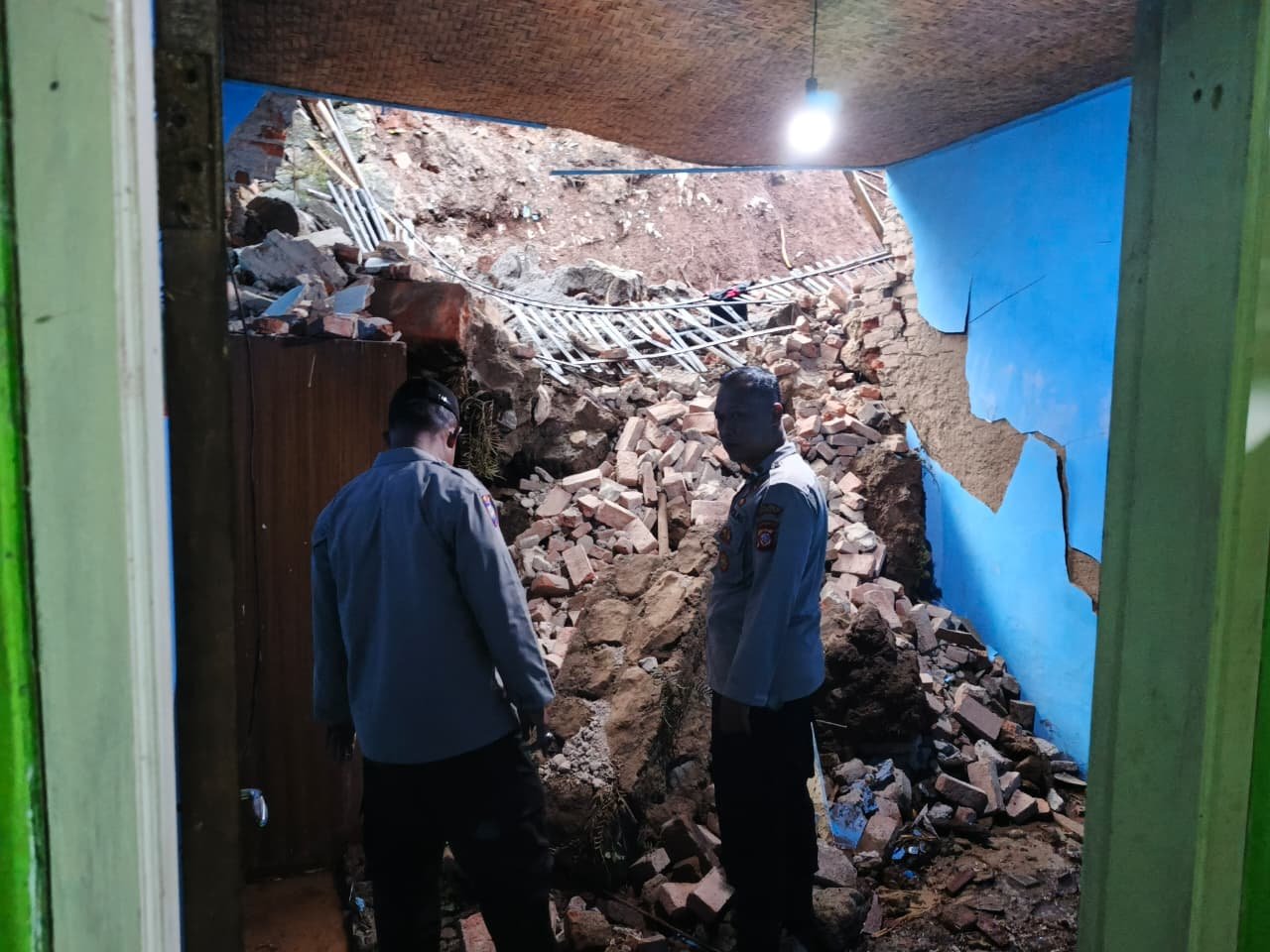 Berdasarkan keterangan di lokasi, hujan deras dalam durasi cukup lama membuat tanah di sekitar rumah tergenang dan tidak mampu menahan tekanan air, sehingga terjadi pergeseran tanah yang kemudian menimpa bagian belakang bangunan rumah.