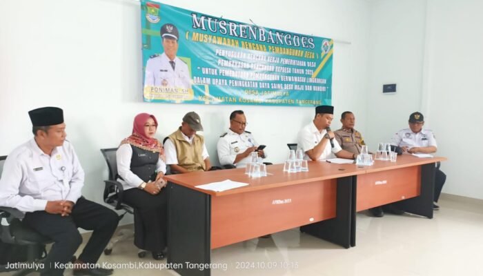 SNU|Kabupaten Tangerang (Benten) – Pemerintah Deda Jatimulya kecamatan Kosambi melaksanakan musyawarah Pembangunan Desa (Musrenbangdes) untuk menyusun  Rencana Kerja Pemerintah Desa (RKPdes) Tahun 2025 kegiatan ini diadakan di aula kantor desa Jatimulya, dihadiri camat Kosambi  H.Asmawi kepala Desa Jatimulya  Poniman, BPD (Badan Perwakilan Desa), perwakilan kelompok masyarakat, tokoh agama, tokoh masyarakat dan berbagai unsur masyarakat, pada kamis (9/10/2024).