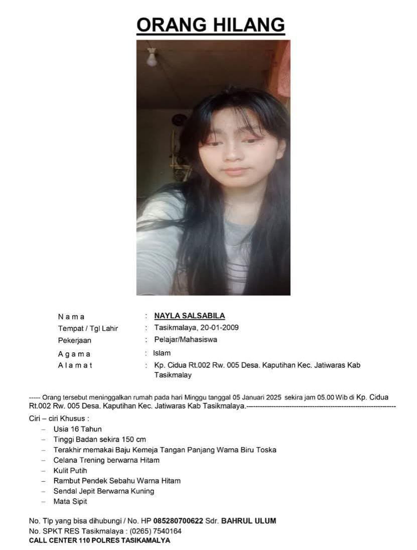 Polres Tasikmalaya mengimbau masyarakat yang memiliki informasi mengenai keberadaan Nayla Salsabila untuk segera melapor ke kepolisian atau menghubungi pihak keluarga. (Krist)