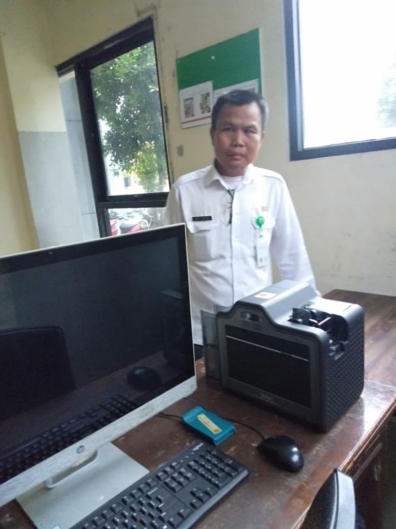 Kasi pelayanan kecamatan Pakuhaji Abdul Wahab bersama mesin cetak fisik KTP.