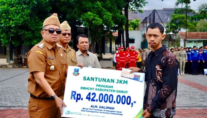 SNU//Garut – Bupati Garut, Abdusy Syakur Amin, menyerahkan secara simbolis kepada 6 ahli waris peserta Jaminan Sosial Ketenagakerjaan Dana Bagi Hasil Cukai Hasil Tembakau (DBHCHT) Kabupaten Garut.