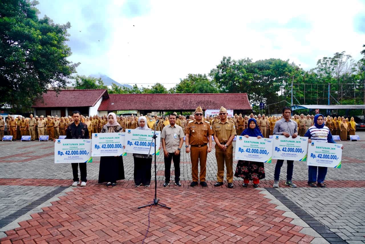 SNU//Garut – Bupati Garut, Abdusy Syakur Amin, menyerahkan secara simbolis kepada 6 ahli waris peserta Jaminan Sosial Ketenagakerjaan Dana Bagi Hasil Cukai Hasil Tembakau (DBHCHT) Kabupaten Garut.