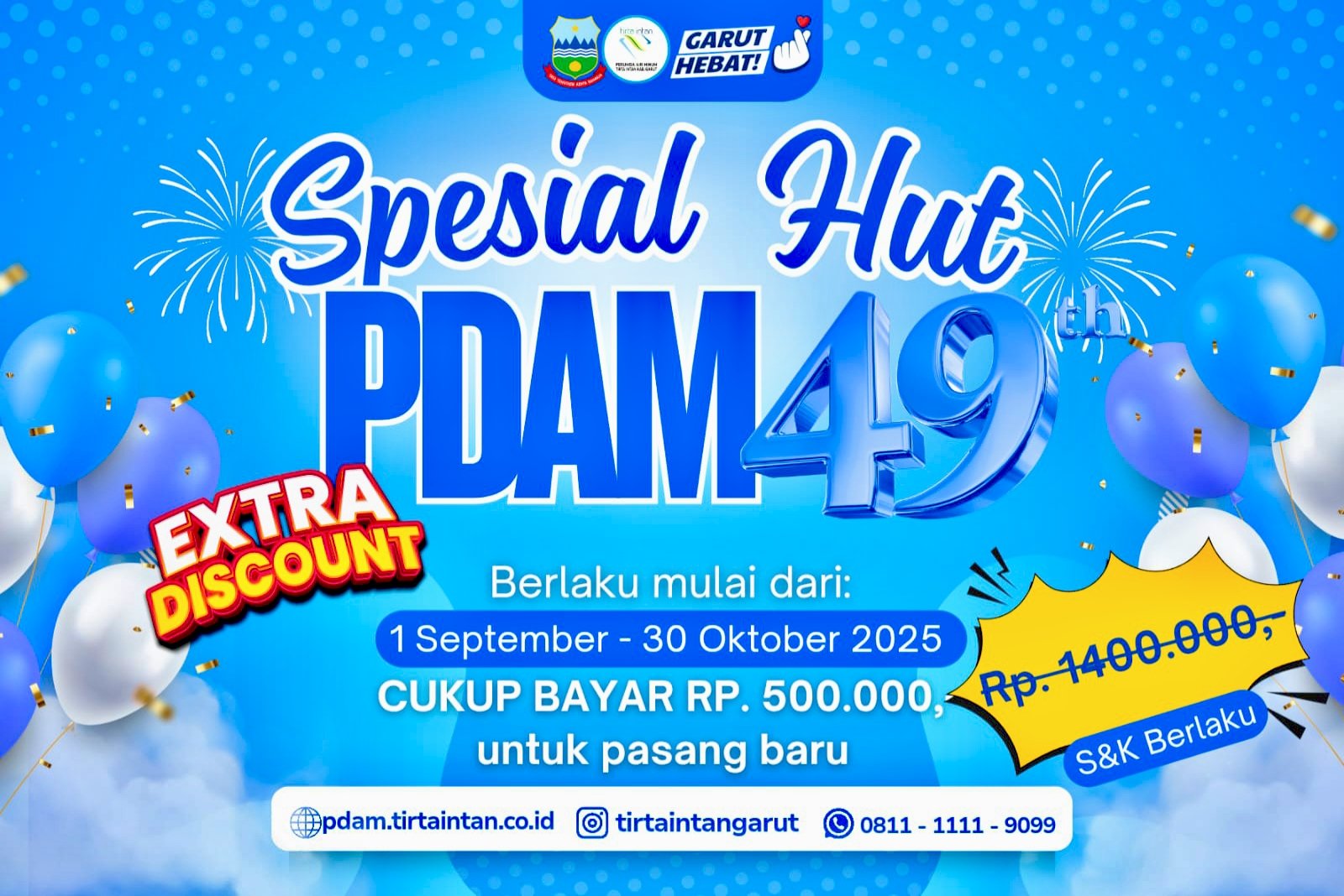 SNU//Kabupaten Garut – Dalam rangka memperingati Hari Ulang Tahun (HUT) ke-49, Perumda Air Minum Tirta Intan Garut menghadirkan promo istimewa bagi masyarakat Kabupaten Garut, yang akan melakukan pemasangan saluran PAM yang baru.