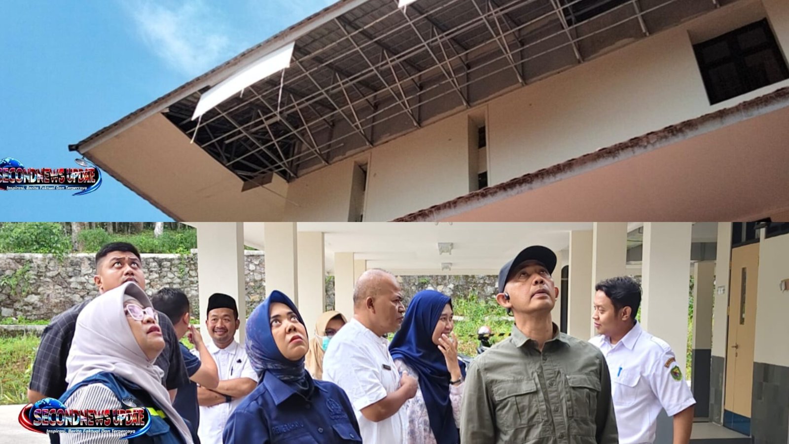 Foto Atas : Plafon yang ambruk di lantai dua terlihat jelas dari bawah. Foto diambil, Rabu (18/3/26) pagi. Foto Bawah : Ketua DPRD Kabupaten Bandung Renie Rahayu Fauzi, didampingi Kadis PUTR meninjau reruntuhan flapin RS Bedas Pacira, Rabu (18/3/26)