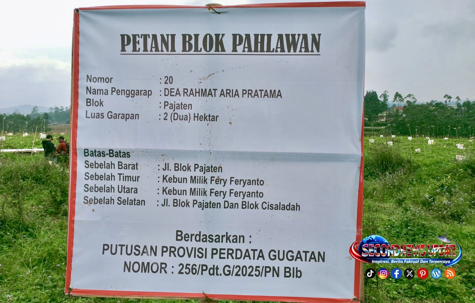 Kabupaten Bandung// secondnewsupdate.co.id – Puluhan plang bertuliskan “Petani Blok Pahlawan” muncul di lahan negara yang dikelola PTPN I Regional 2 Kebun Malabar, Kabupaten Bandung. Tercantum nomor gugatan provisi perdata, publik mempertanyakan legalitas penggarapan.