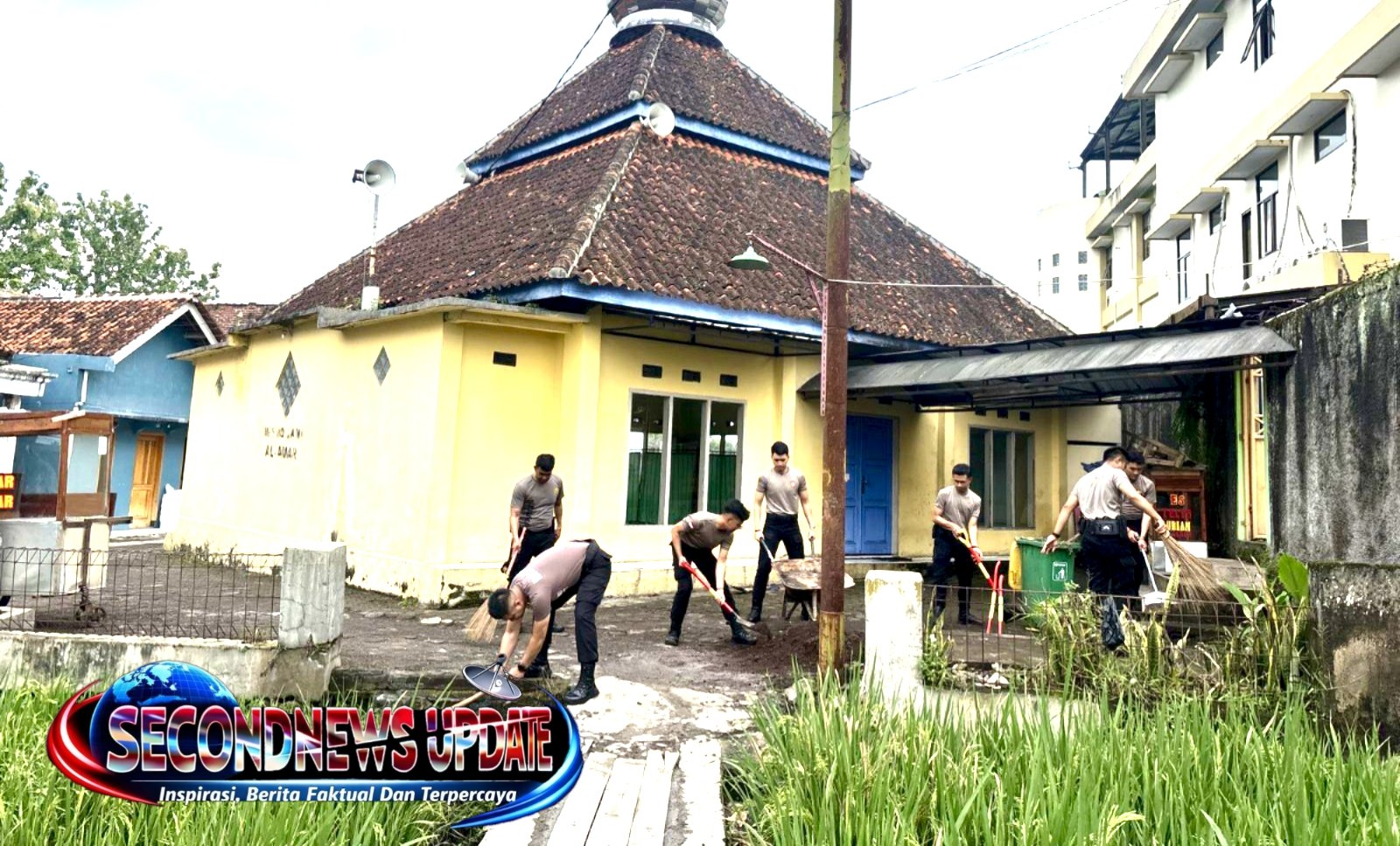 Sejumlah personel tampak bergotong royong membersihkan berbagai area masjid, mulai dari halaman, tempat wudhu, hingga ruang utama yang digunakan untuk ibadah.