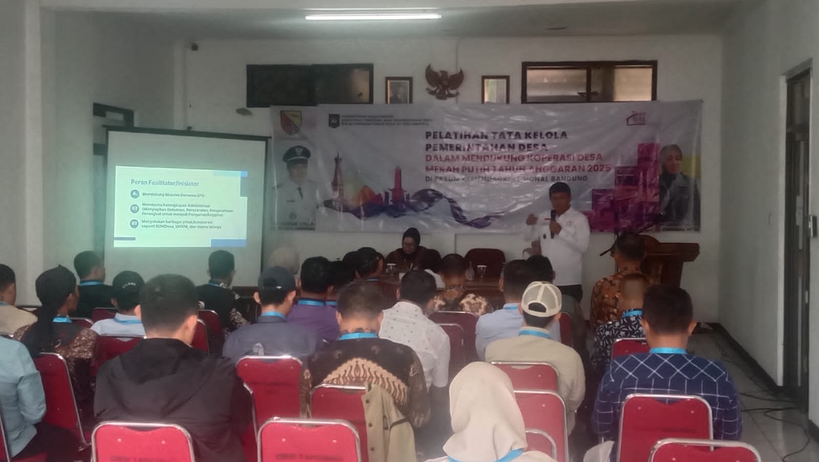 Sejumlah Nara sumber dari PPSDM Kemendagri Regional Bandung diperkenalkan untuk memaparkan sekitar materi terkait tata kelola pemerintah dalam mendukung KDMP, di aula desa Cangkuang Wetan, Rabu (12/11/25)