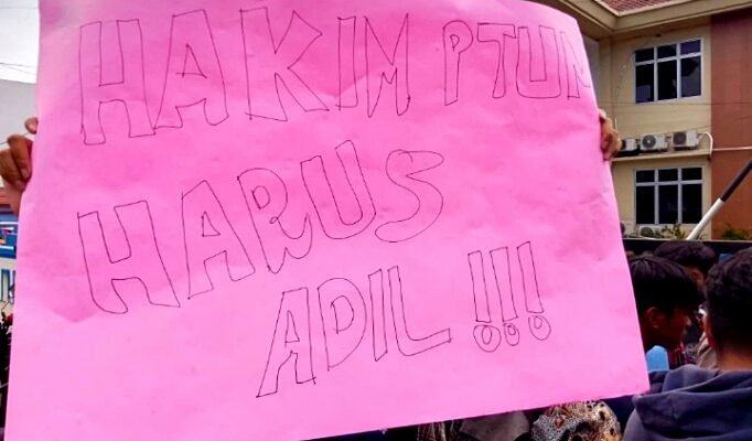 Sekira pukul 11.00 WIB mahasiswa membawa pengeras suara dan beberapa poster yang bertuliskan “Hakim PTUN harus adil, jangan ada kongkalikong di PTUN !!”.