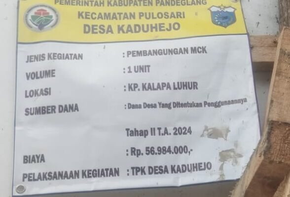 SNU|Kabupaten Pandeglang Banten – Proyek Pembangunan Mandi Cuci Kakus (MCK) yang menelan Rp 56.984.000, yang dianggarkan dari pemerintah pusat kepada desa dengan jumlah yang tidak sedikit, bertujuan untuk mempercepat pembangunan. Diduga tidak dimaksimalkan oleh pemerintah desa Kaduhejo Kecamatan Pulosari Kabupaten Pandeglang.
