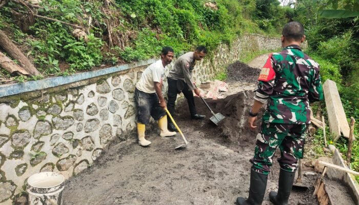 SNU|Kabupaten Garut – Dalam rangka memperkuat kerjasama dan mempererat hubungan antara TNI, Polri, serta masyarakat, anggota TNI dari Koramil Banjarwangi bersama Polsek Banjarwangi menggelar kegiatan kerja bakti pengecoran jalan di Kampung Cisereh, Desa Dangiang, Kecamatan Banjarwangi, Kabupaten Garut, pada Senin (07/01/2025).