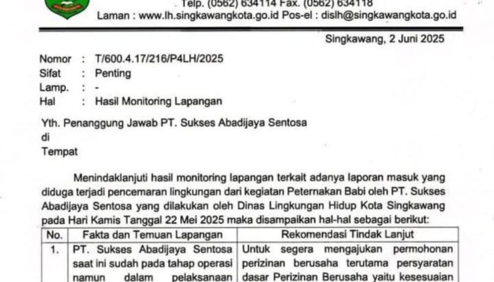 Temuan dari Dinas Lingkungan Hidup (DLH) Kota Singkawang turut memperkuat dugaan pelanggaran. Dalam konfirmasi melalui pesan WhatsApp, Kepala DLH Kota Singkawang membenarkan bahwa pihaknya telah menerbitkan surat resmi terkait temuan pelanggaran lingkungan di lokasi peternakan.